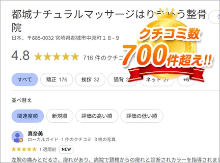 都城ナチュラル整骨院は、開院から19年を迎え、地域の皆さまに親しまれている整骨院です。長年にわたり痛みや不調の改善に真摯に取り組み、一人ひとりに合わせた丁寧な施術を行うことで、多くの患者さまから信頼をいただいてきました。2025年現在、Googleビジネスプロフィールには700件以上の口コミが投稿され、平均評価4.8という高評価をいただいております。寄せられる温かいお言葉や感謝のメッセージは、スタッフ全員にとって何よりの励みです。これからもその声に応え続け、技術と心の両面から地域の皆さまの健康づくりを支援していけるよう努めてまいります。都城で「相談してよかった」と感じていただける整骨院を目指し、真心を込めて施術いたします。